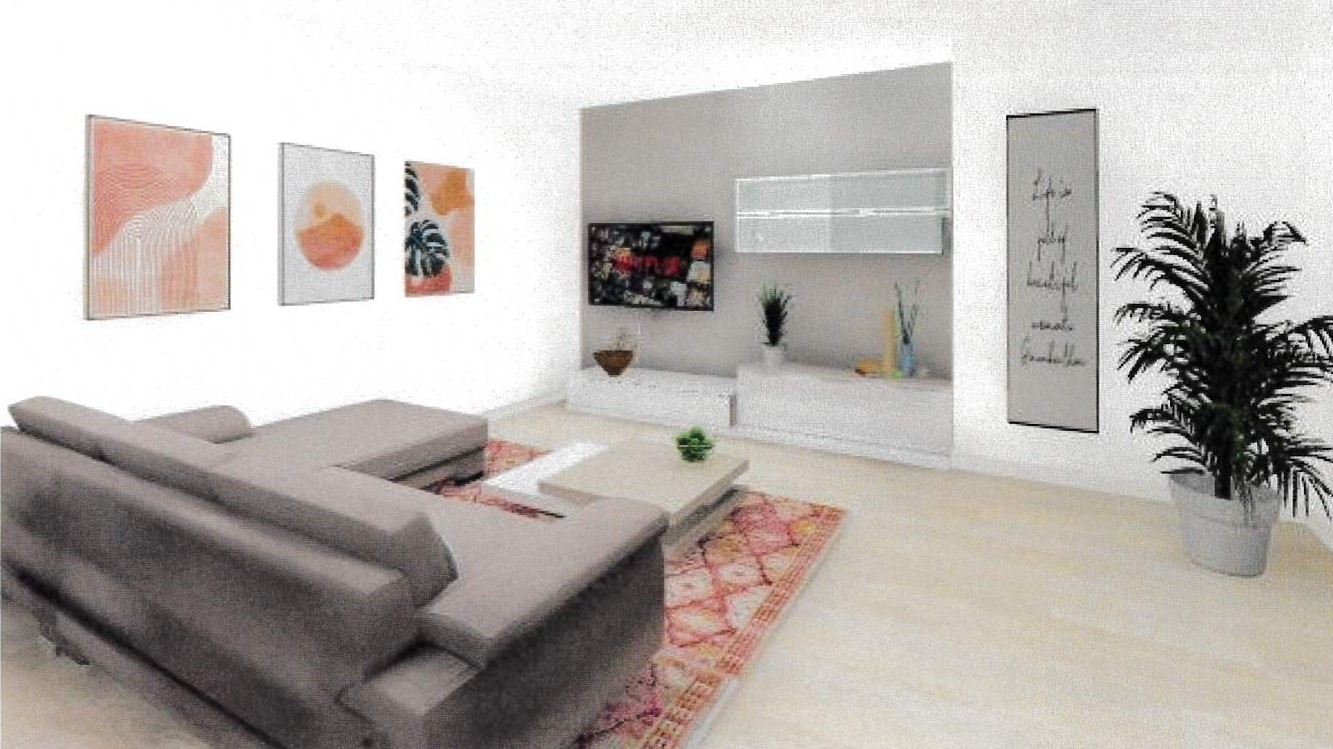 Al piano primo, si compone di ingresso, ampia zona cucina/soggiorno openspace, bagno finestrato con doccia, secondo bagno/lavanderia, tre camere e terrazzo vivibile. Ascensore. Garage doppio. Riscaldamento/raffreddamento aria/acqua in pompa di calore.